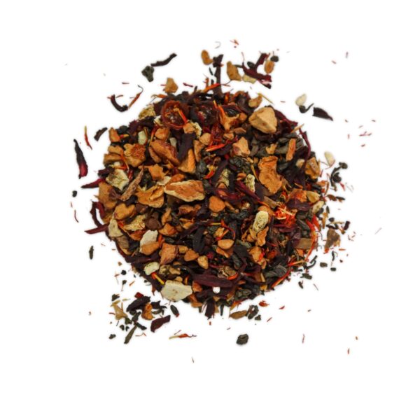 Organic Blend of Apple, Hibiscus, Gunpowder tea, Rosehip, Cinnamon, Safflower, Lemon Peel, Orange Peel and Cloves